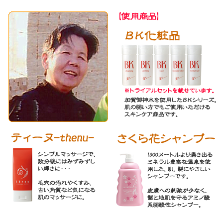BKシリーズを使い始めて2ヶ月を過ぎました。心の垢を落としながら生きようと日々の生活を送っていましたが、BKとの出会いと母の生き様を振り返り、日頃からお肌の垢も落として、美しい素肌でいたいものだと思うようになりました。さくら花シャンプーとティーヌの組み合わせで髪もツヤツヤ、頭皮マッサージも快適です。